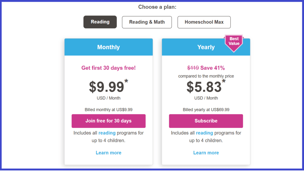 Like Sylvan Learning, this best reading program for kids does not explicitly state the price. However, multiple user reviews indicate that monthly prices usually start from $165. Additionally, there is a one-time $50 registration fee and a $30 materials fee.