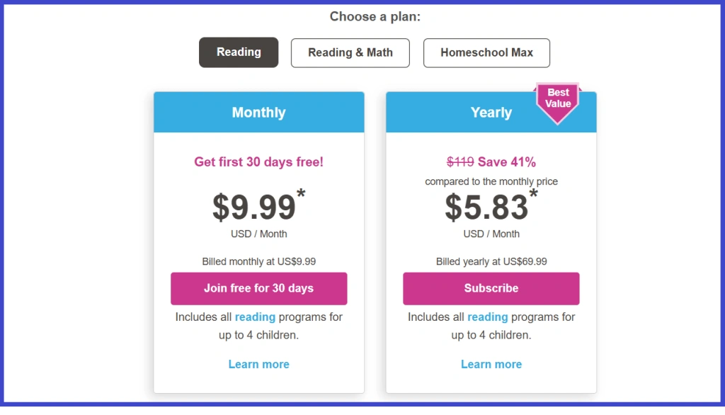 Reading Eggs will strongly encourage you to book both of its programs: reading and math. This way, you’ll save more per subject. Thus, the reading-only pricing will cost you $9.99, while the combination with math will be worth $13.99.