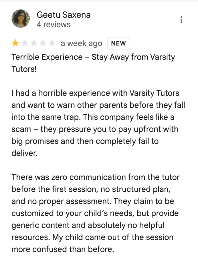 “There was zero communication from the tutor before the first session, no structured plan, and no proper assessment. They claim to be customized to your child’s needs, but provide generic content and absolutely no helpful resources. My child came out of the session more confused than before.”