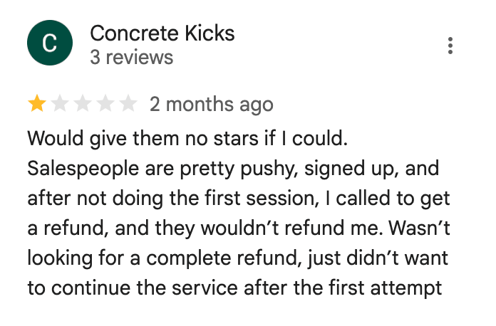 “Would give them no stars if I could. Salespeople are pretty pushy, signed up, and after not doing the first session, I called to get a refund, and they wouldn’t refund me. Wasn’t looking for a complete refund, just didn’t want to continue the service after the first attempt.”