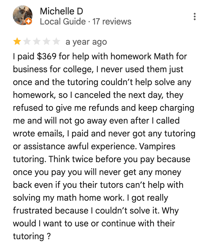 “I paid $369 for help with homework Math for business for college, I never used them just once and the tutoring couldn’t help solve any homework, so I canceled the next day, they refused to give me refunds and keep charging me and will not go away even after I called wrote emails, I paid and never got any tutoring or assistance awful experience.”