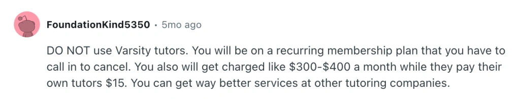 “DO NOT use Varsity tutors. You will be on a recurring membership plan that you have to call in to cancel. You also will get charged like $300-$400 a month while they pay their own tutors $15. You can get way better services at other tutoring companies.”