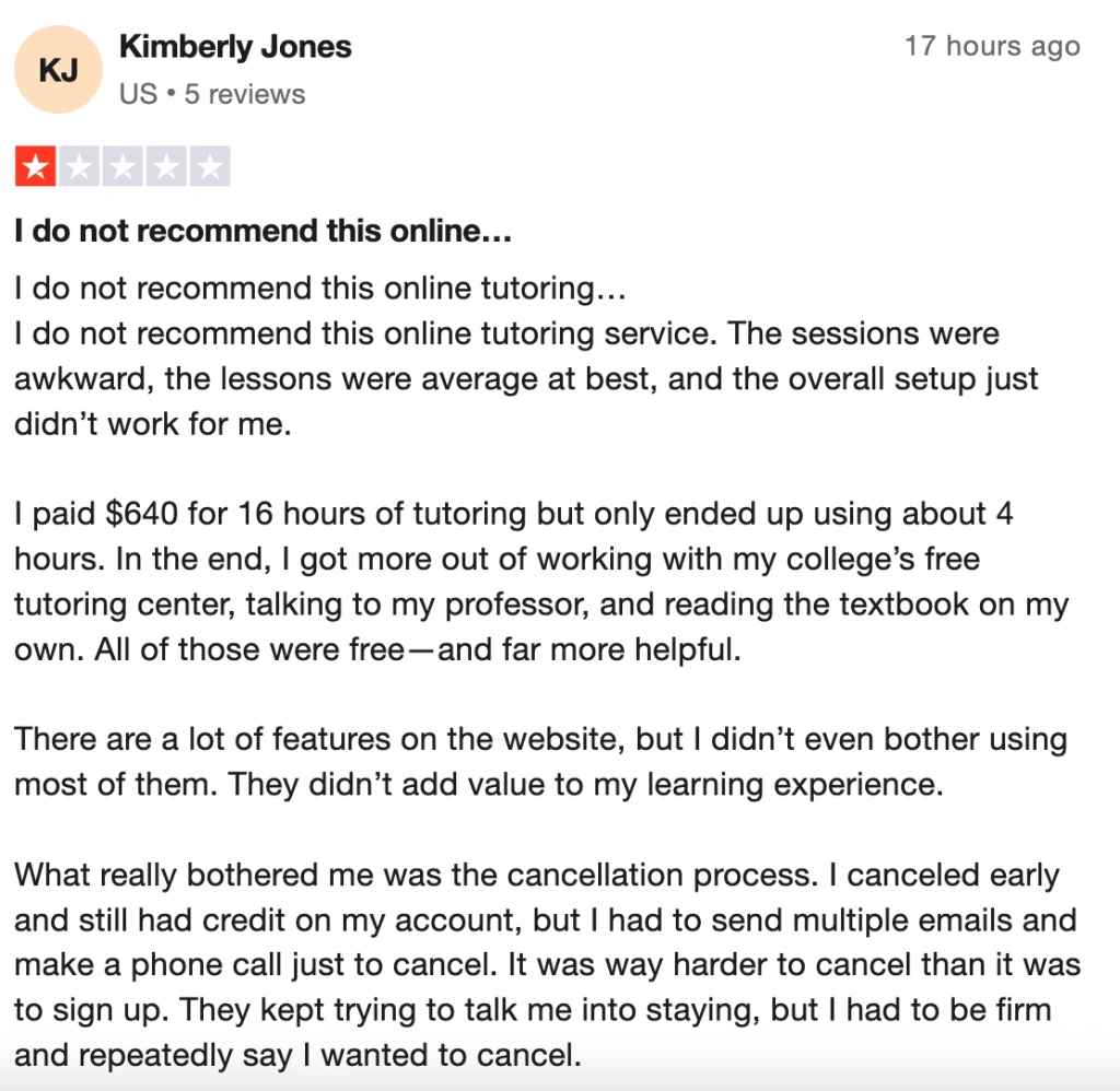 This review highlights the poor value for money offered by Varsity Tutors. With the high price of $640 for 16 hours of learning, this user did not see any improvement in their learning or knowledge. This review also focuses on the fact that a difficult cancellation process is common amongst Varsity Tutors complaints.