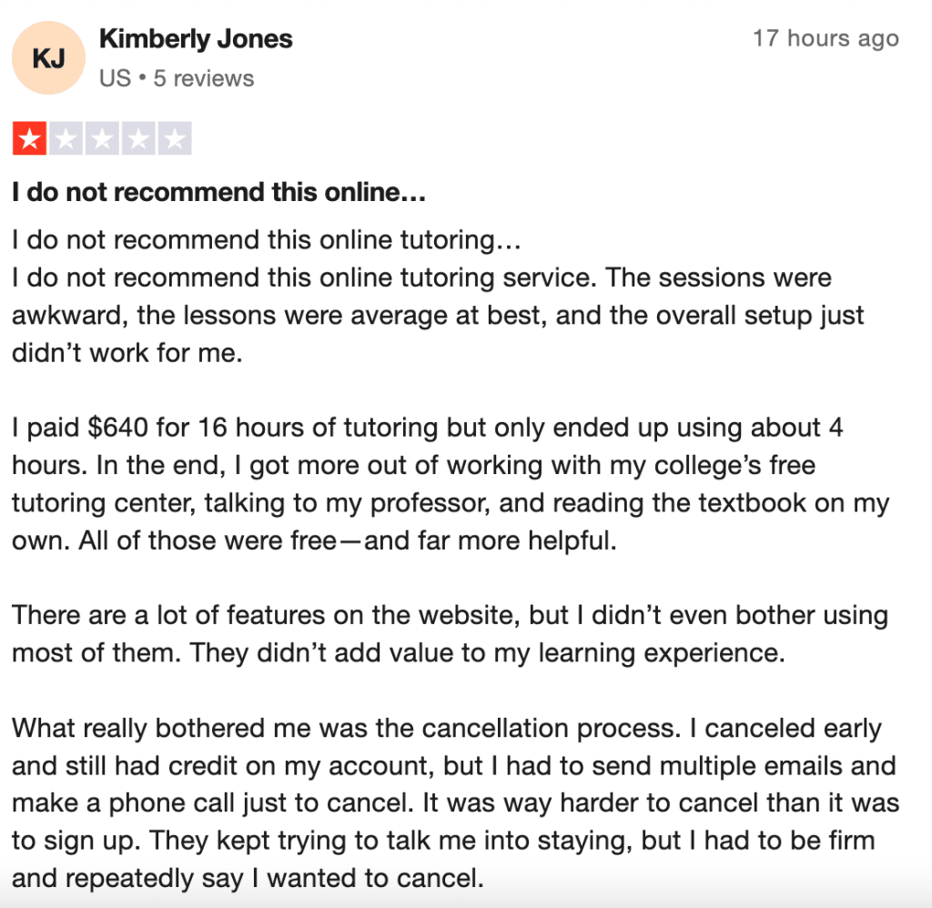 “I do not recommend this online tutoring service. The sessions were awkward, the lessons were average at best, and the overall setup just didn’t work for me.