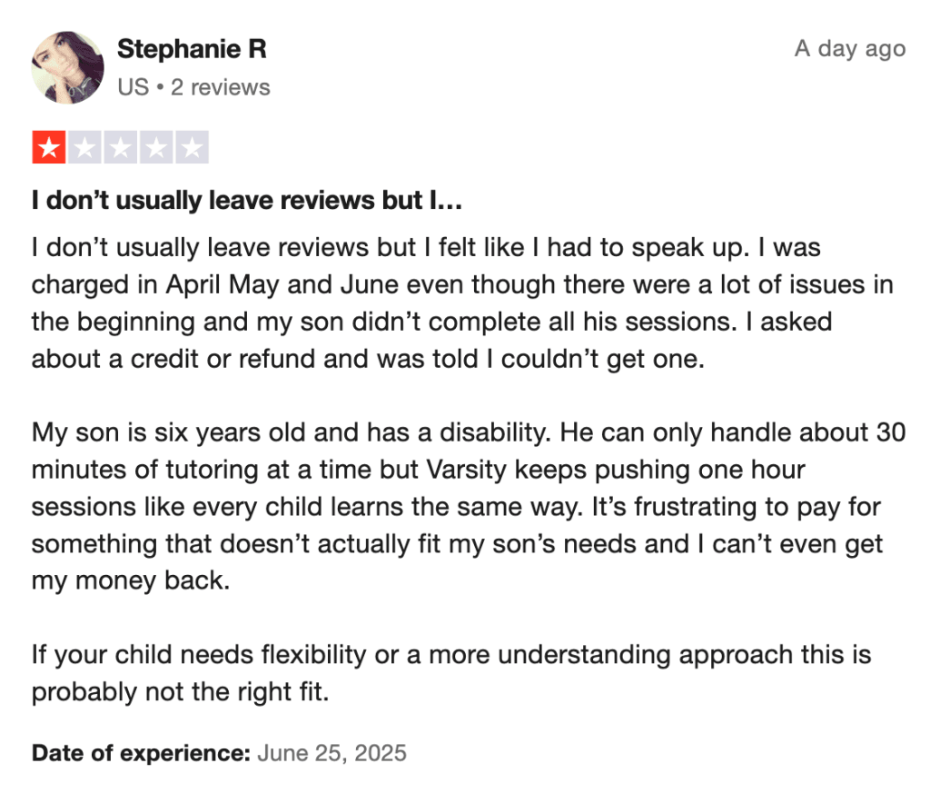 “I don’t usually leave reviews but I felt like I had to speak up. I was charged in April, May and June even though there were a lot of issues in the beginning and my son didn’t complete all his sessions. I asked about a credit or refund and was told I couldn’t get one. My son is six years old and has a disability. He can only handle about 30 minutes of tutoring at a time but Varsity keeps pushing one hour sessions like every child learns the same way.”