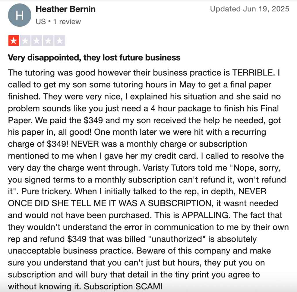 “NEVER was a monthly charge or subscription mentioned to me when I gave her my credit card. I called to resolve the very day the charge went through. Varsity Tutors told me “Nope, sorry, you signed terms to a monthly subscription can’t refund it, won’t refund it”. Pure trickery. When I initially talked to the rep, in depth, NEVER ONCE DID SHE TELL ME IT WAS A SUBSCRIPTION, it wasn’t needed and would not have been purchased. This is APPALLING. The fact that they wouldn’t understand the error in communication to me by their own rep and refund $349 that was billed “unauthorized” is absolutely unacceptable business practice.”