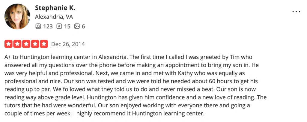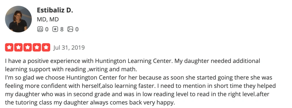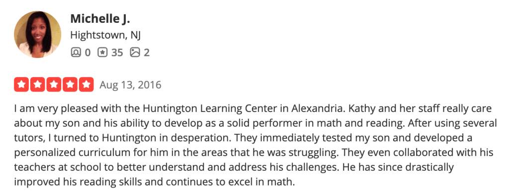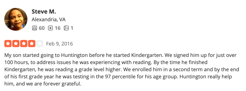 Some parents in Huntington Learning Center reviews on Yelp say that the Huntington Learning Center has improved their kids’ grades and proficiency in areas like reading, after many hours of studying.