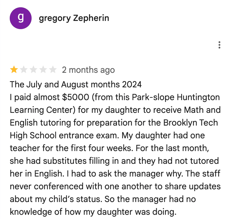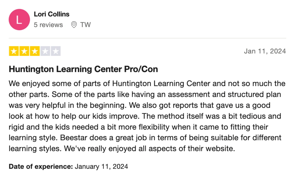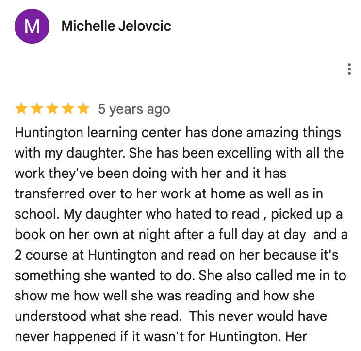 However, other Huntington Learning Center Google reviews state the learning methods are too rigid and don’t take into account children’s unique learning styles.