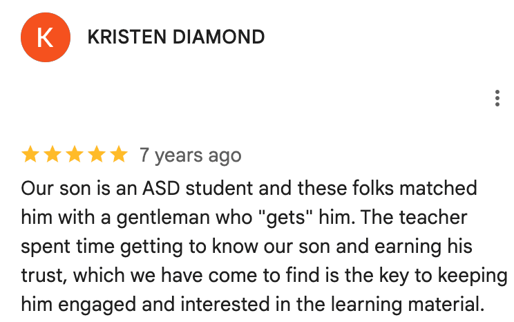 “Our son is an ASD student and these folks matched him with a gentleman who “gets” him. The teacher spends time getting to know our son and earning his trust.” – Google Review