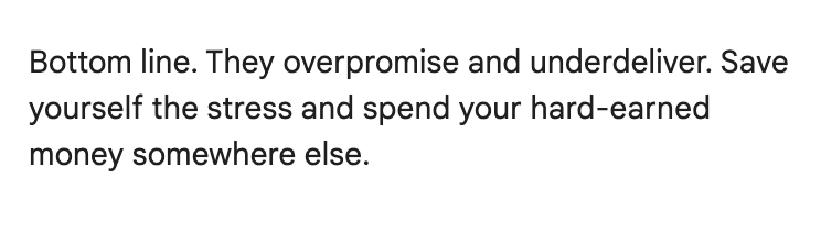 “Bottom line. They overpromise and underdeliver.” – Google Review