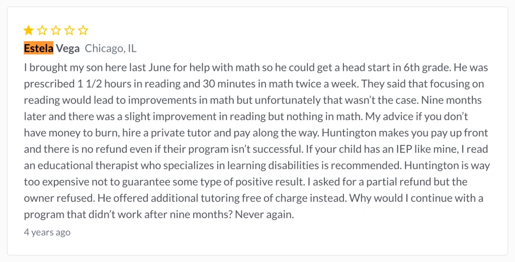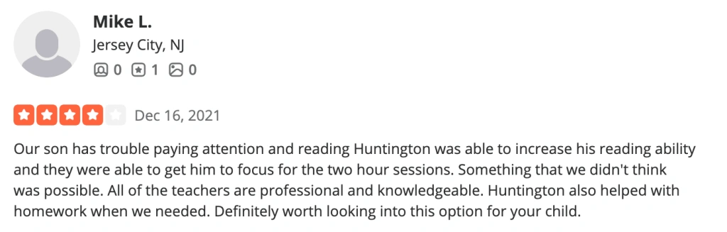 Reviews seem to be split pretty evenly on whether Huntington Learning Center improves grades or not. Some say their child’s progress has exceeded their expectations, while others remark that their child has not improved or, in some cases, has regressed.
