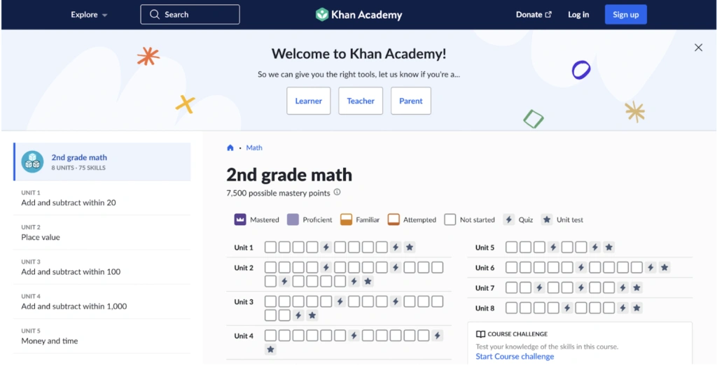 One of the best Khan Academy benefits I noticed is self-progression. This is where learners aren’t forced to keep up with a specific schedule or learning structure – they can manage their learning themselves. The service also allows students to review topics as many times as needed and move forward only when they feel confident. I must admit it can be really useful for some students.