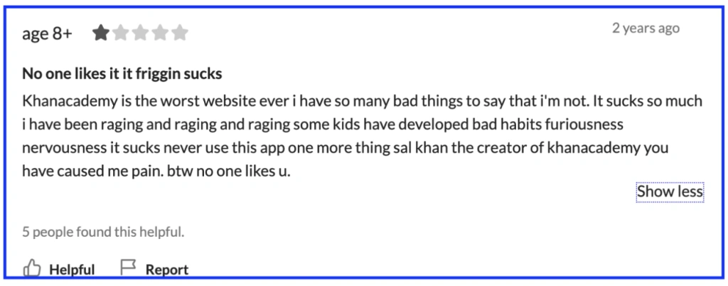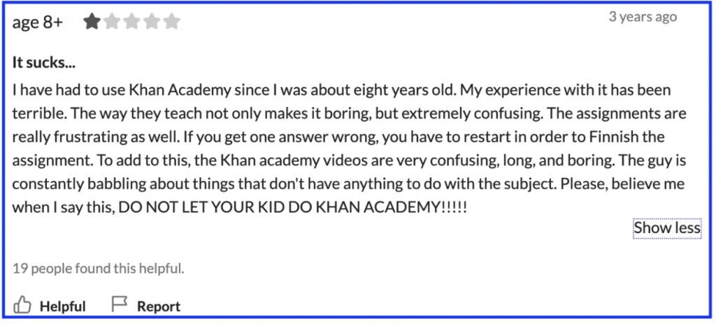 Here’s a Khan Academy rating from a user highlighting the challenges with the platform. 👇