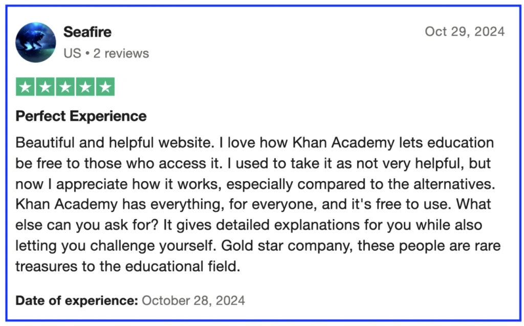 “Khan Academy has everything for everyone, and it’s free to use.” – TrustPilot review