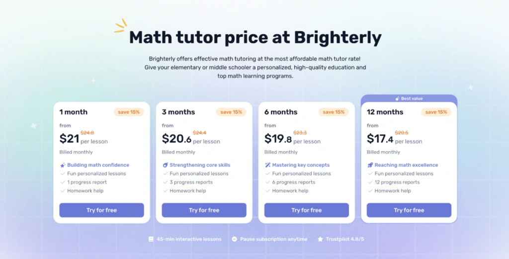 Brighterly offers affordable pricing from $17.3/lesson, which is quite cost-effective compared to competitors on the market. For instance, according to this research, the standard tutoring rate around the United States is between $20 and $80.