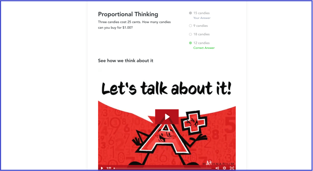 - Knowledge check tests — The service allows your child to go through a basic knowledge assessment. Upon completing a quick test, you’ll be able to see their right and wrong answers, and will also receive the list of original Mathnasium materials on each question covered.