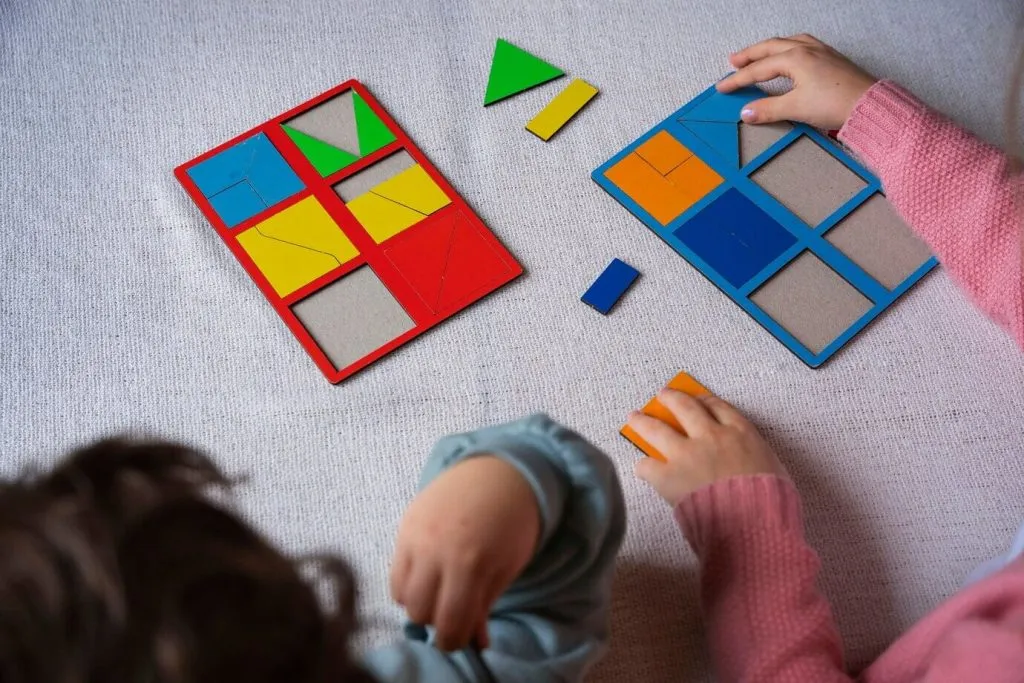 You should have several sets of tangrams and pattern cards for this task. First, children should analyze the shapes they see.