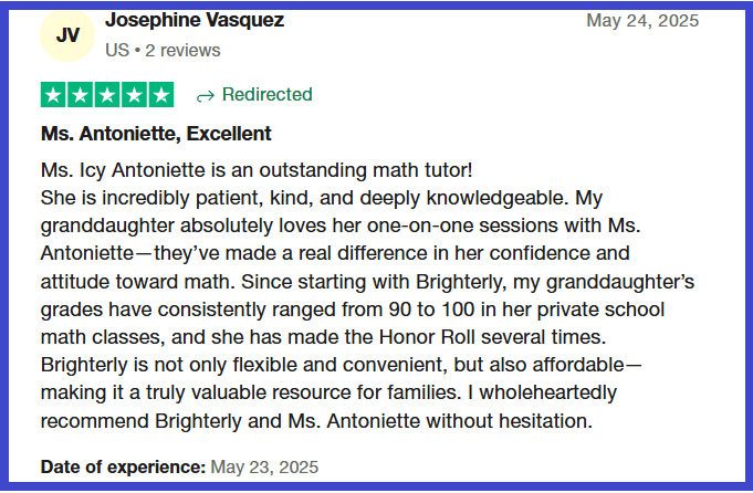 “I’m happy my child is busy during her summer vacation with her maths tutoring with Brighterly. It is helping her focus and getting her ready for her 7th grade, and I believe she won’t be lost once school starts.” — Trustpilot review