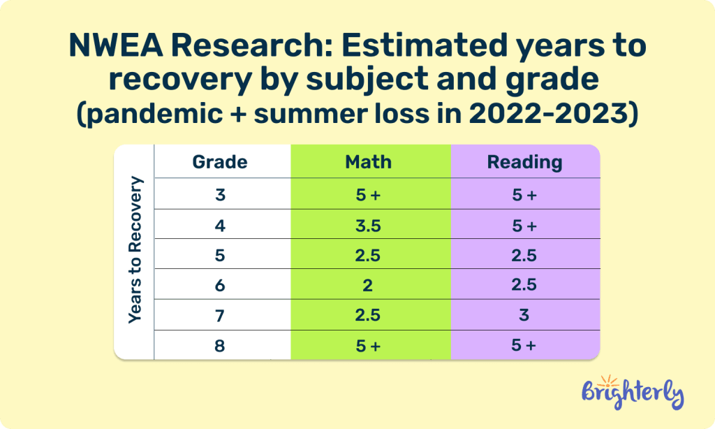 On the NWEA tests, reading gaps increased by 36% during 2023-2024 and math gaps increased by 18%. | A cumulative effect of summer loss is still evident: by 5th grade, students can lag behind by 2.5-3 years. |
