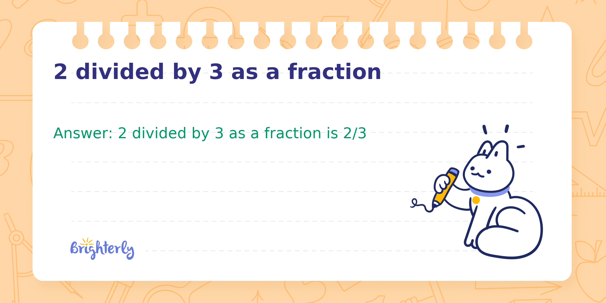Dividing 2 by 3 can be represented using a fraction, which is a way to show the division of two numbers. Fractions express how many parts of a whole are being considered. Here, '2 divided by 3' simply means how much each part would have if you split 2 into 3 equal sections.