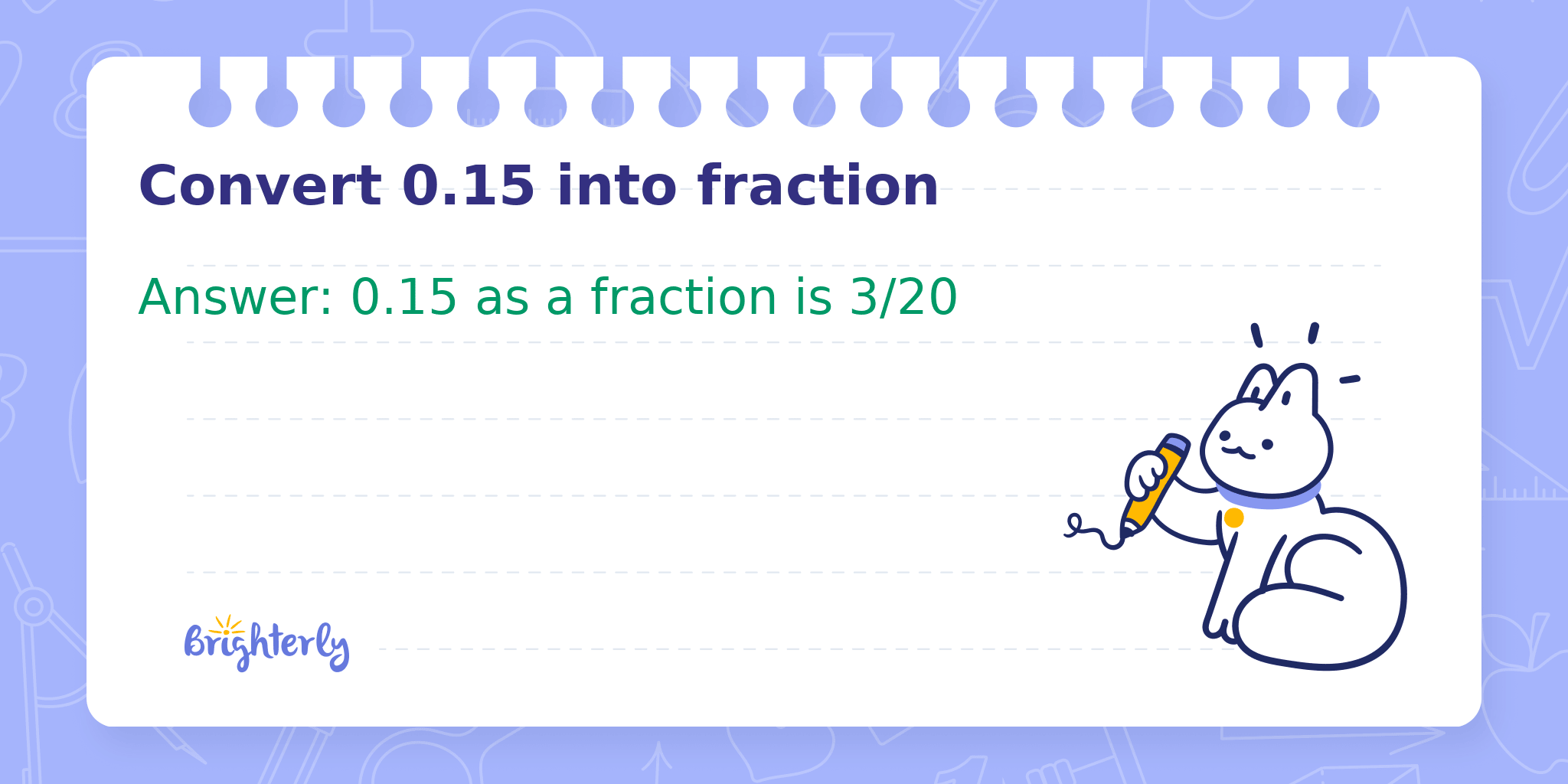 Step 1: Step 1: Count how many digits are after the decimal (two for 0.15), so multiply numerator and denominator by 100 to get 15/100