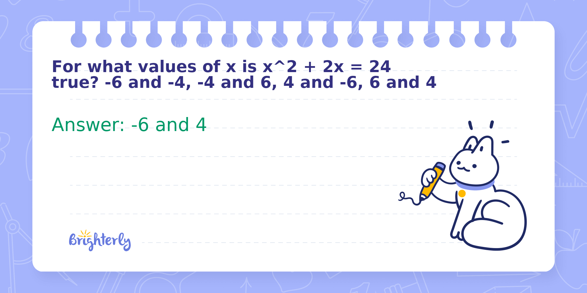 For what values of x is x^2 + 2x = 24 true? -6 and -4, -4 and 6, 4 and -6, 6 and 4