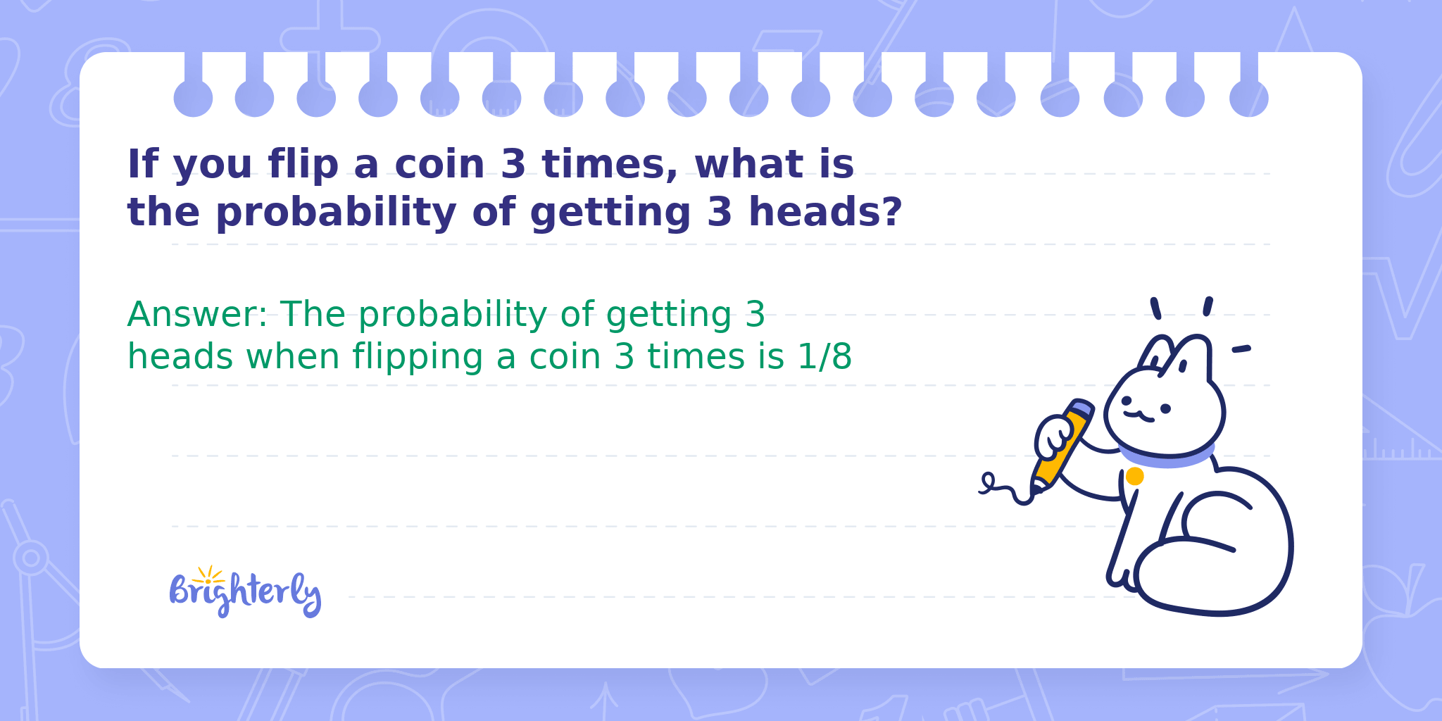 Answer: The probability of getting 3 heads when flipping a coin 3 times is 1/8