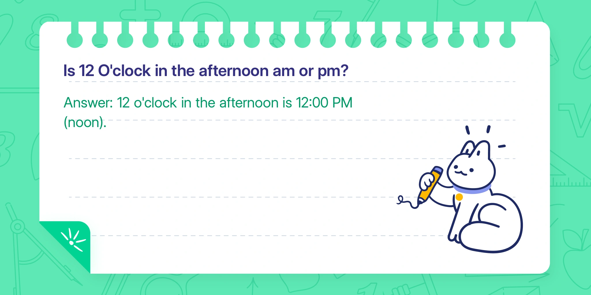 Answer: 12 o'clock in the afternoon is 12:00 PM (noon).