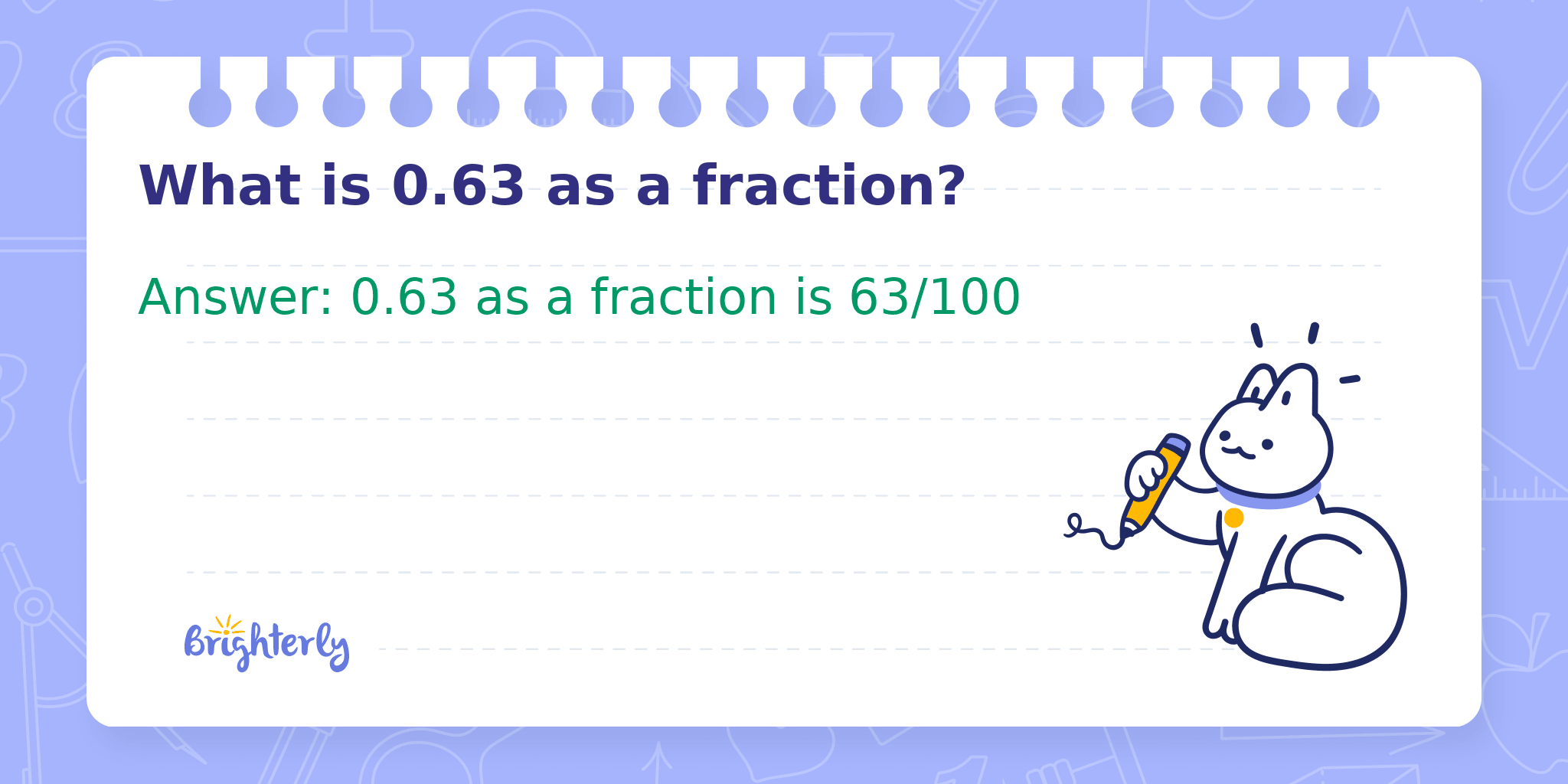 Step 2: Step 2: 0.63 × 100 = 63 and 1 × 100 = 100, giving the fraction 63/100