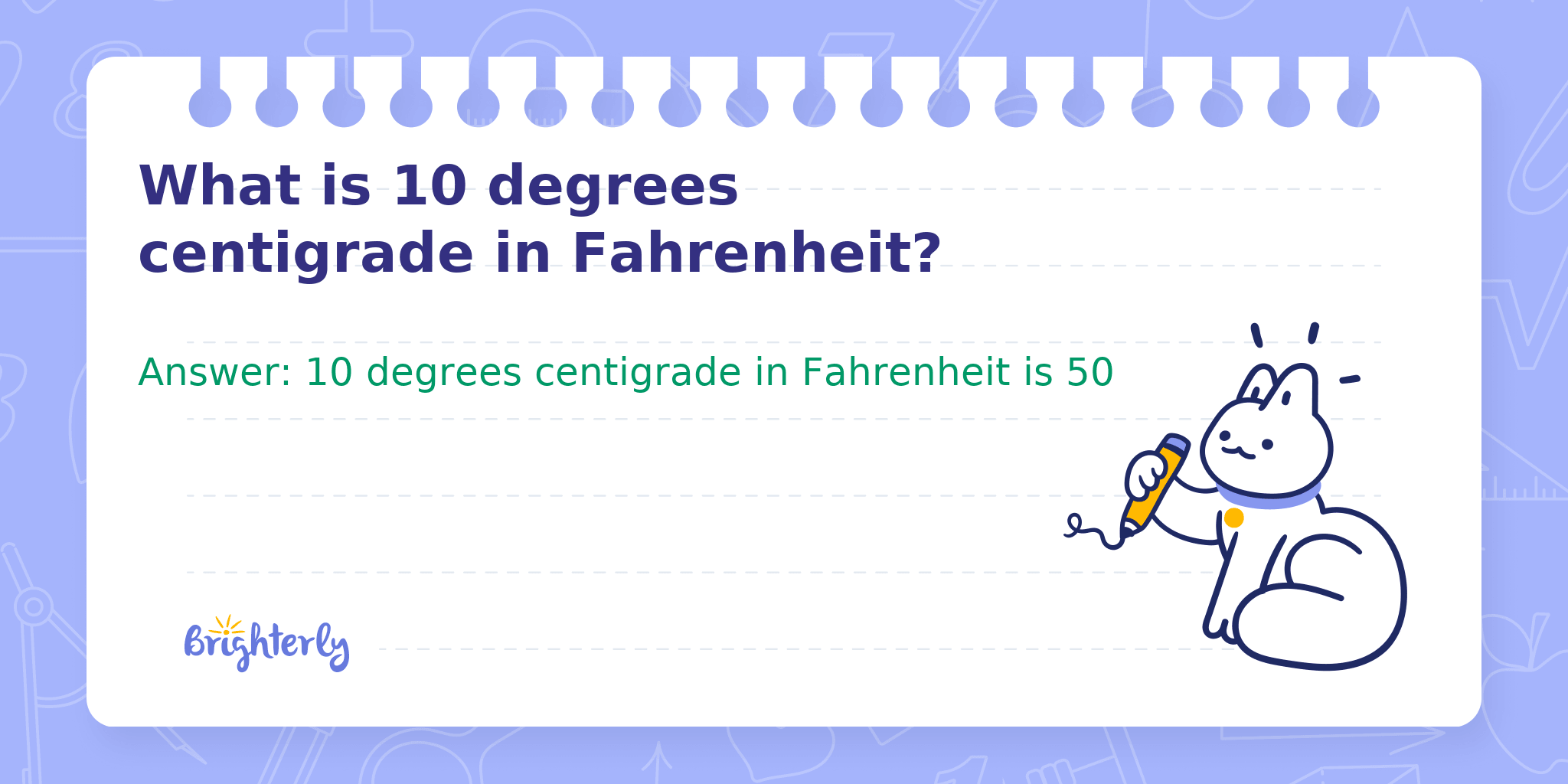 Answer: 10 degrees centigrade in Fahrenheit is 50