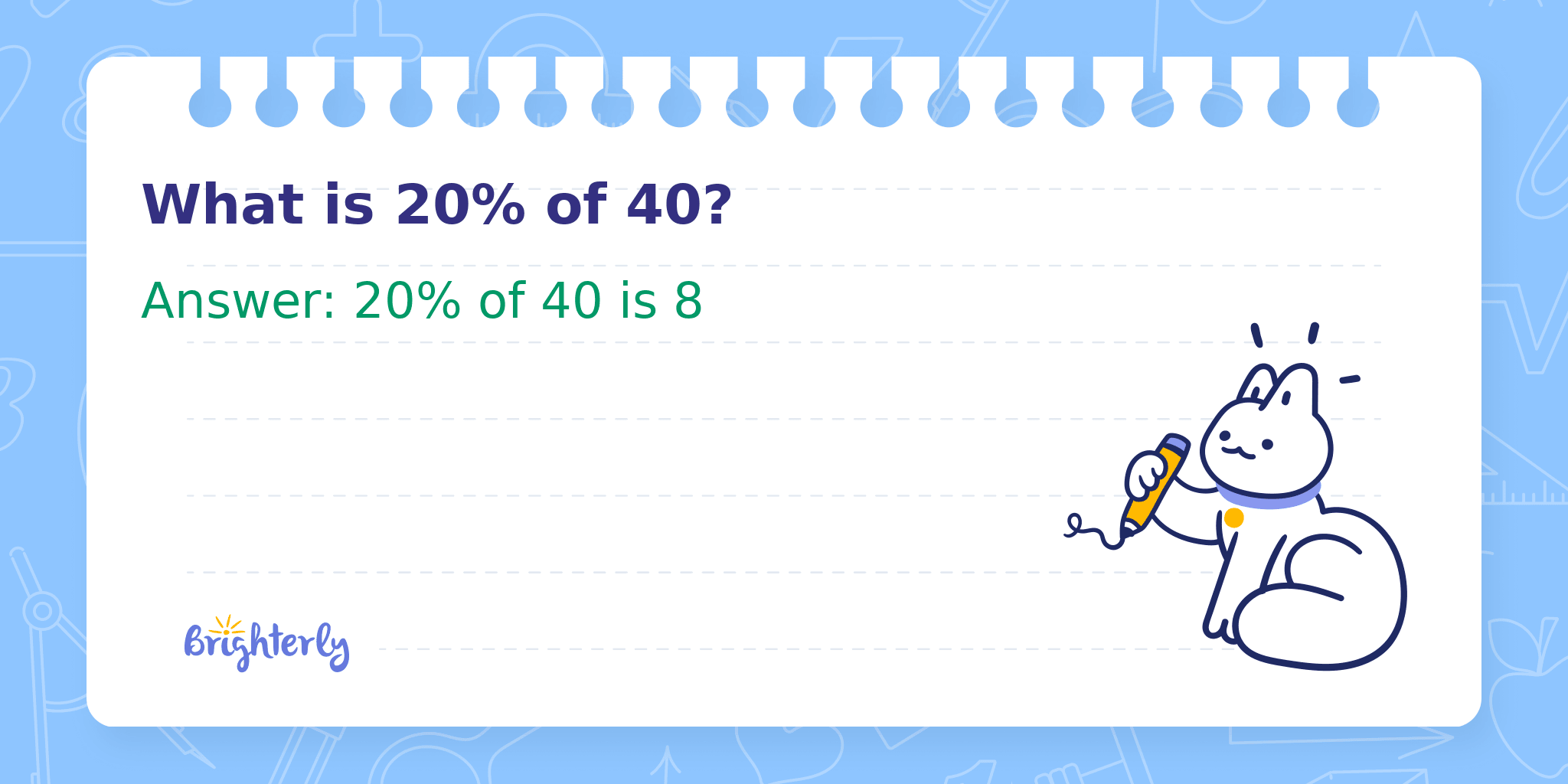 Finding a percentage of a number is a fundamental math skill used in everyday life, such as calculating discounts, tips, or parts of a total. Here, we are determining what 20% of the number 40 equals.