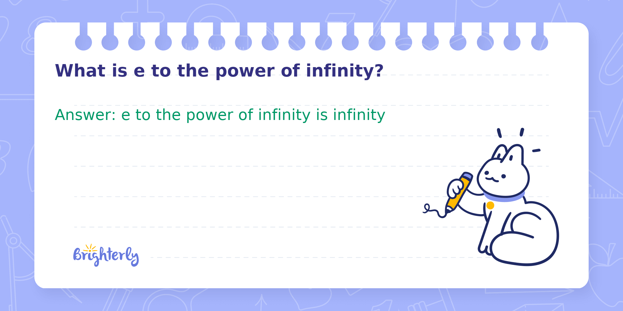 In mathematics, expressions like 'e to the power of infinity' involve understanding how exponential growth behaves as its exponent becomes extremely large. The constant 'e' (approximately 2.71828) is the base of natural logarithms, and exponentiation with e is fundamental throughout calculus, especially when discussing limits and growth rates.
