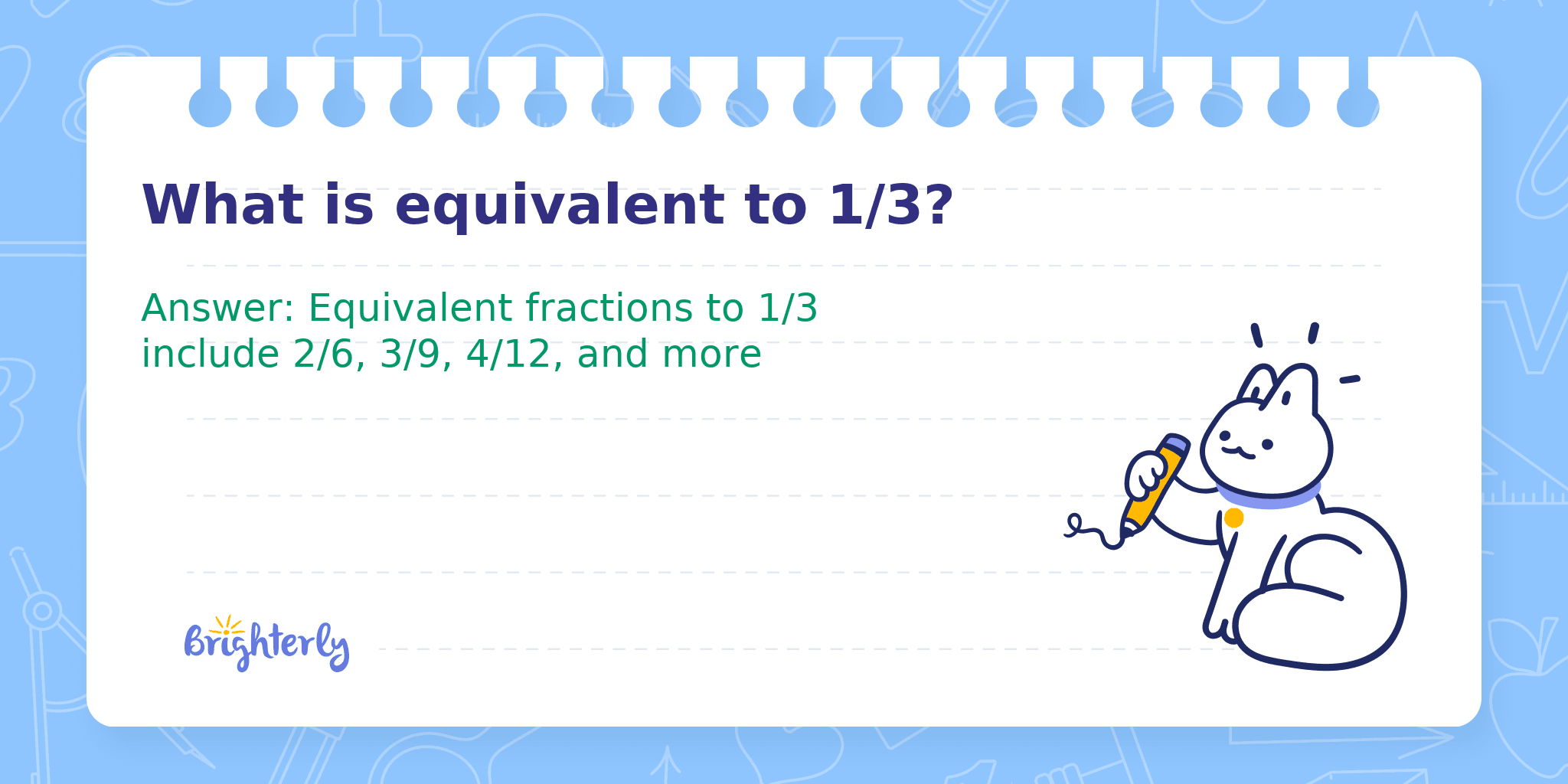 Answer: Equivalent fractions to 1/3 include 2/6, 3/9, 4/12, and more