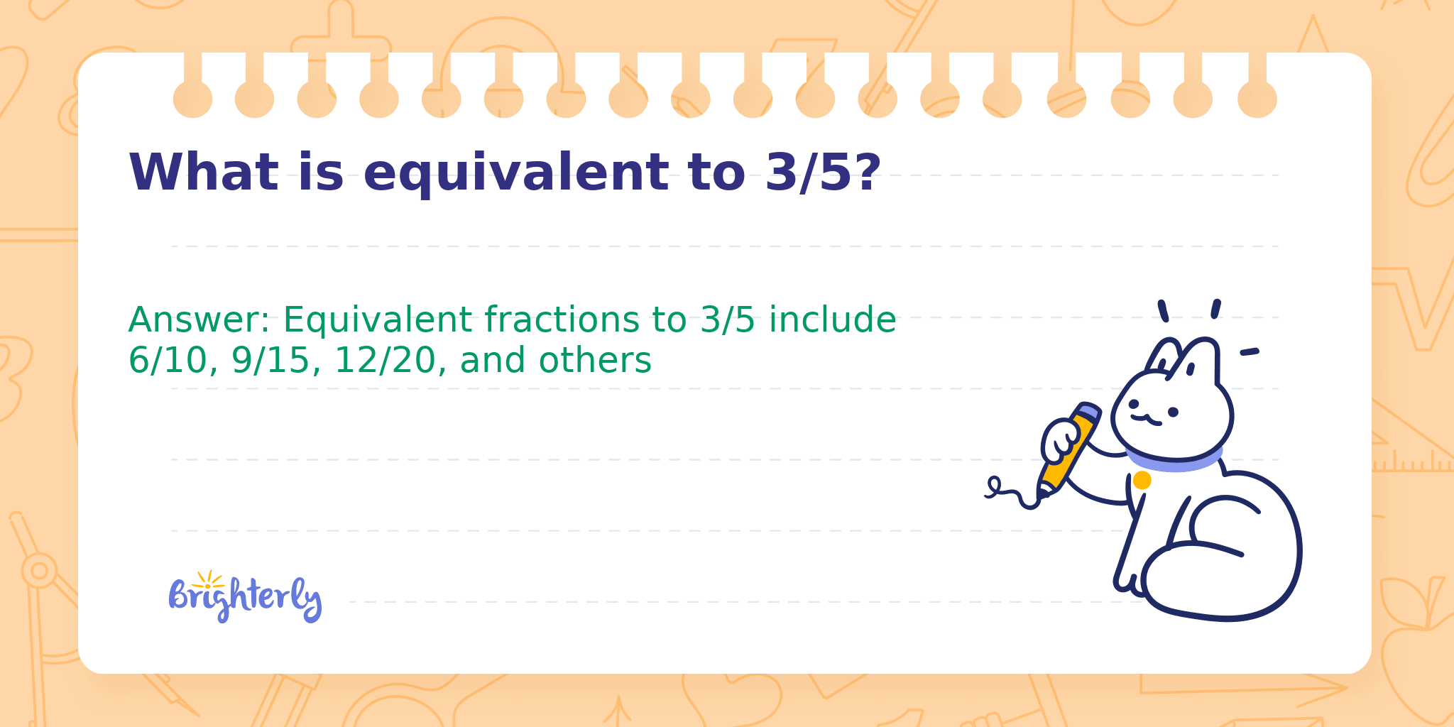 Answer: Equivalent fractions to 3/5 include 6/10, 9/15, 12/20, and others