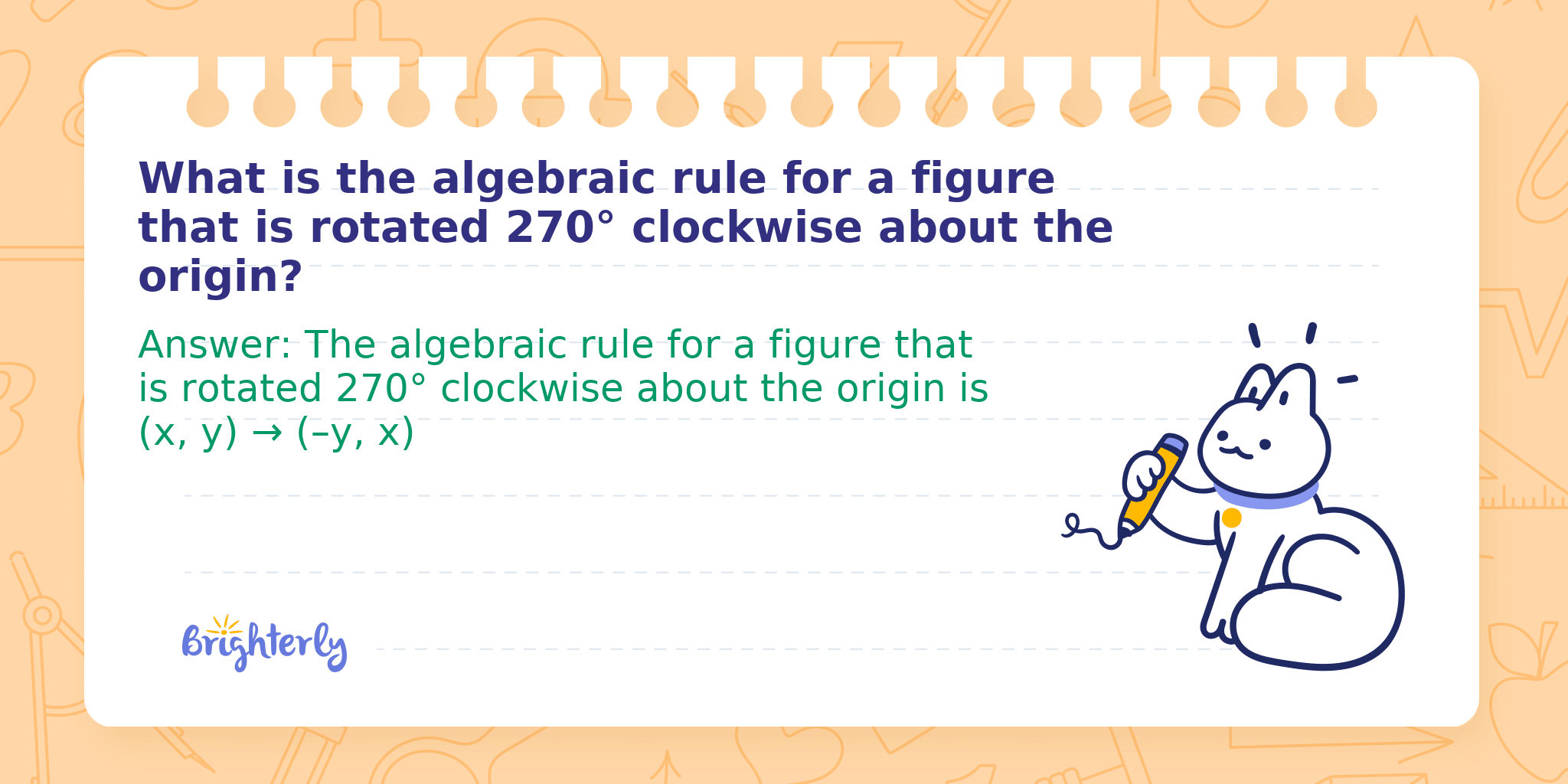 Answer: The algebraic rule for a figure that is rotated 270° clockwise about the origin is (x, y) → (–y, x)