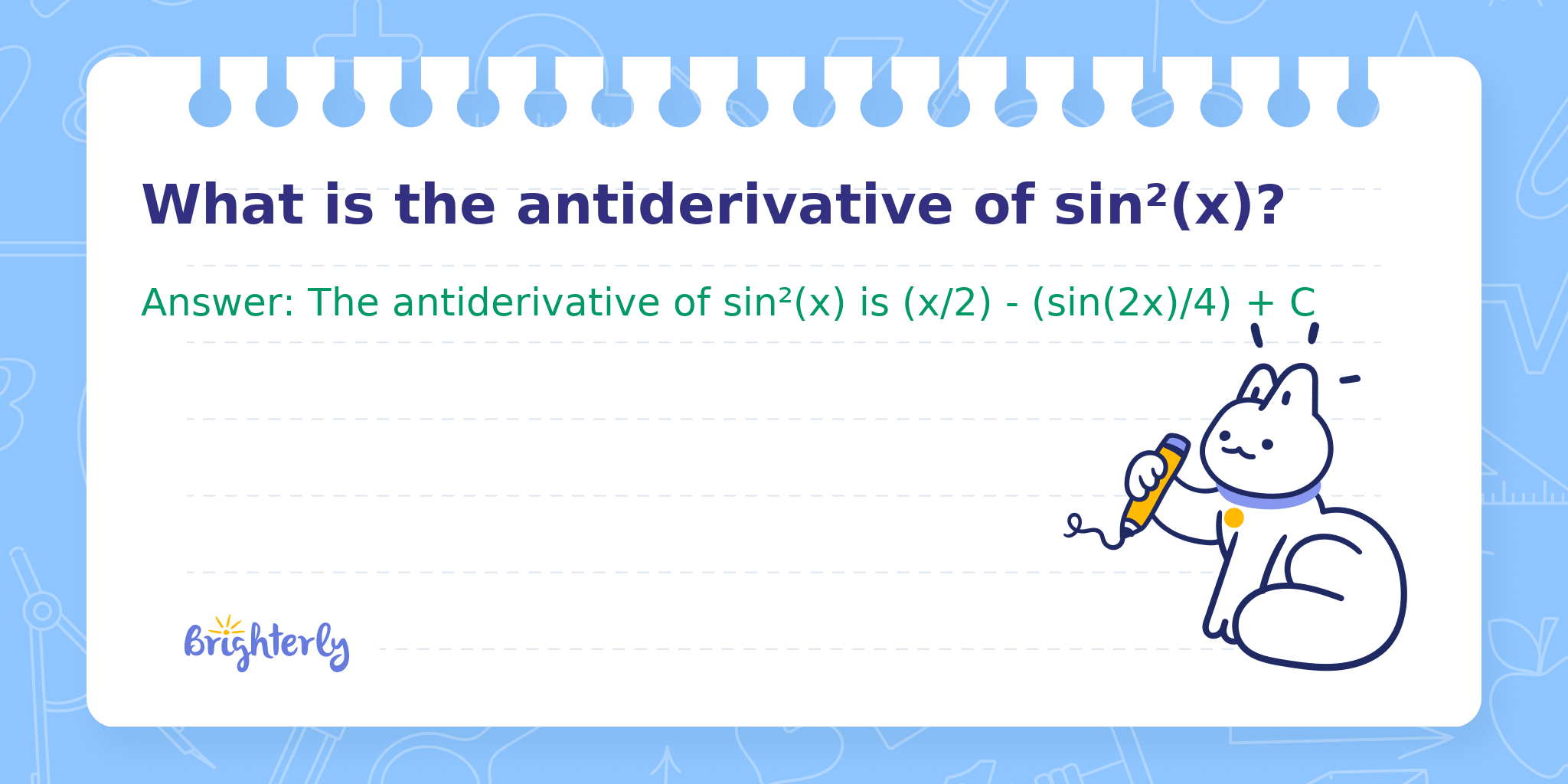 Answer: The antiderivative of sin²(x) is (x/2) - (sin(2x)/4) + C