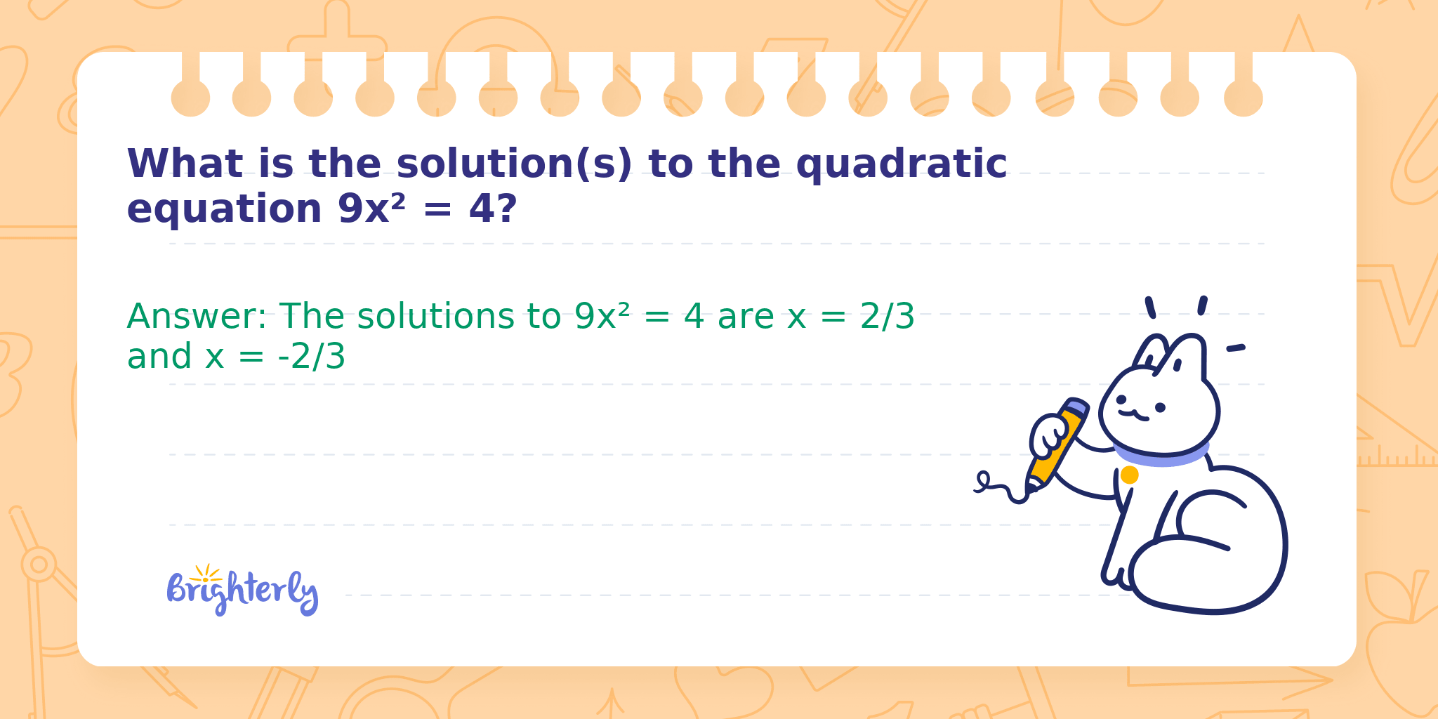 Answer: The solutions to 9x² = 4 are x = 2/3 and x = -2/3