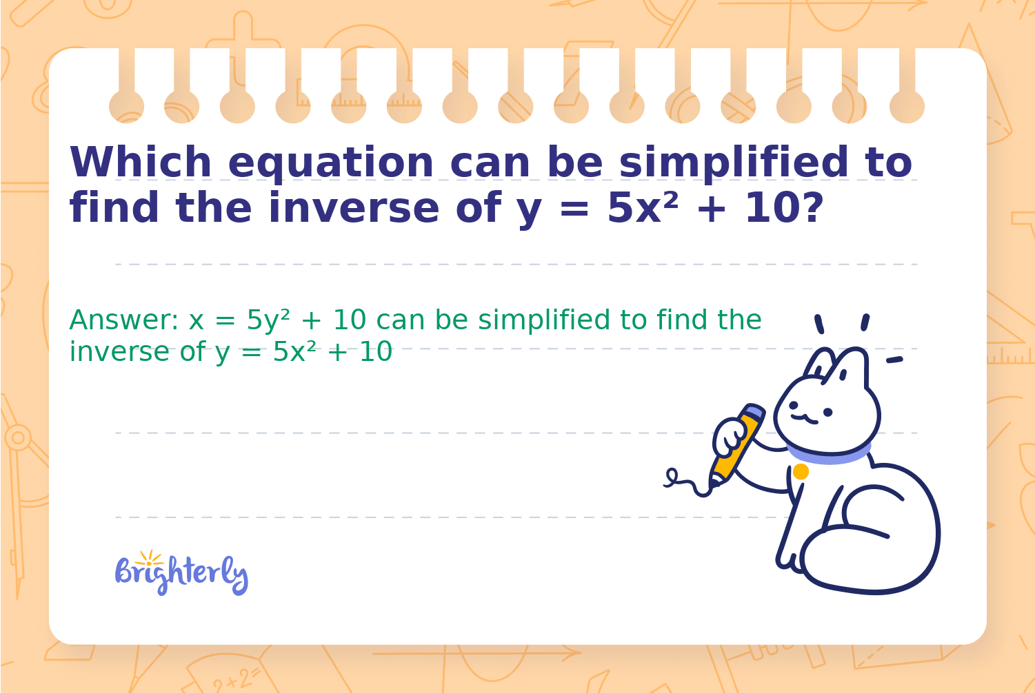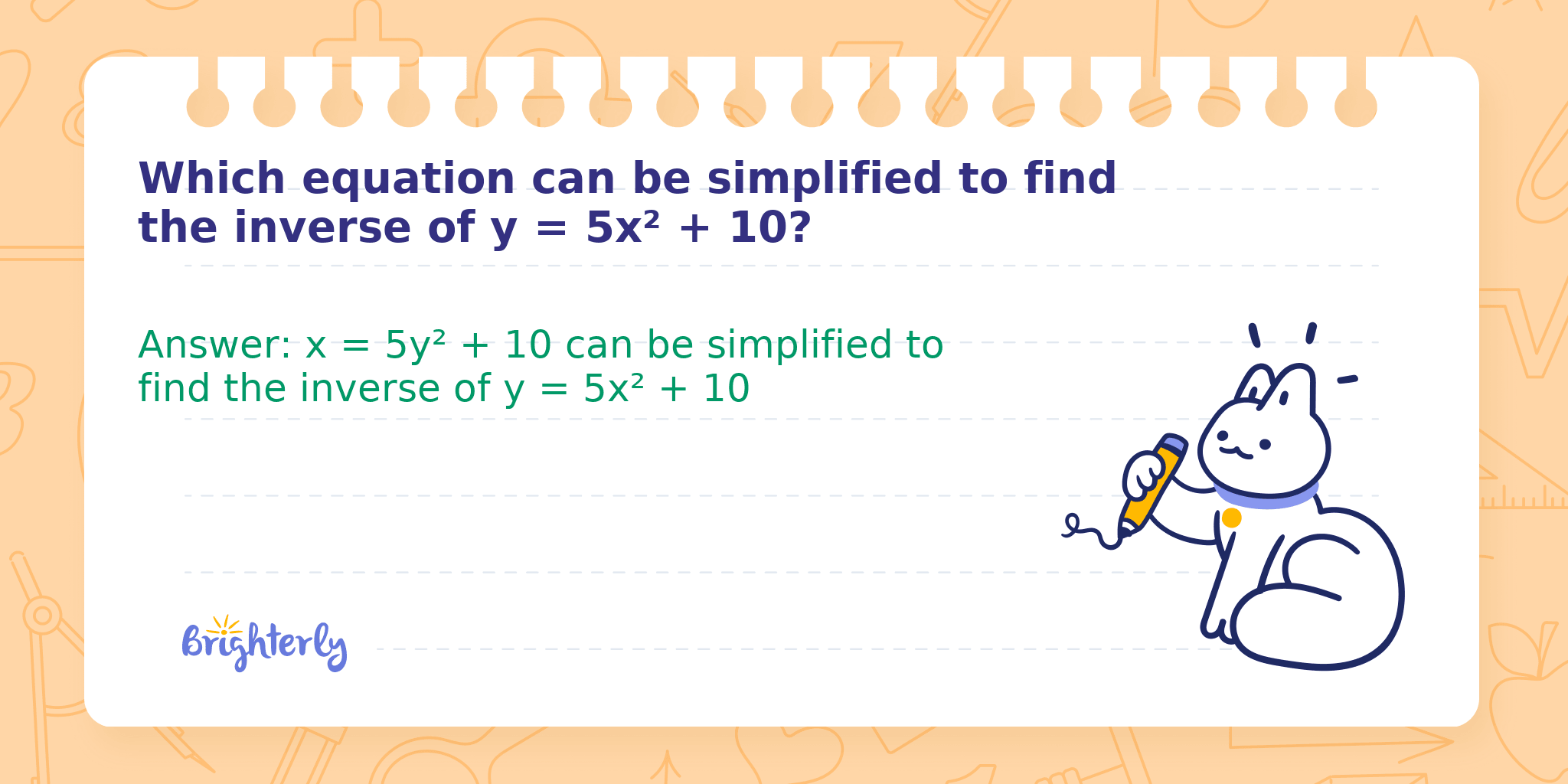 Answer: x = 5y² + 10 can be simplified to find the inverse of y = 5x² + 10