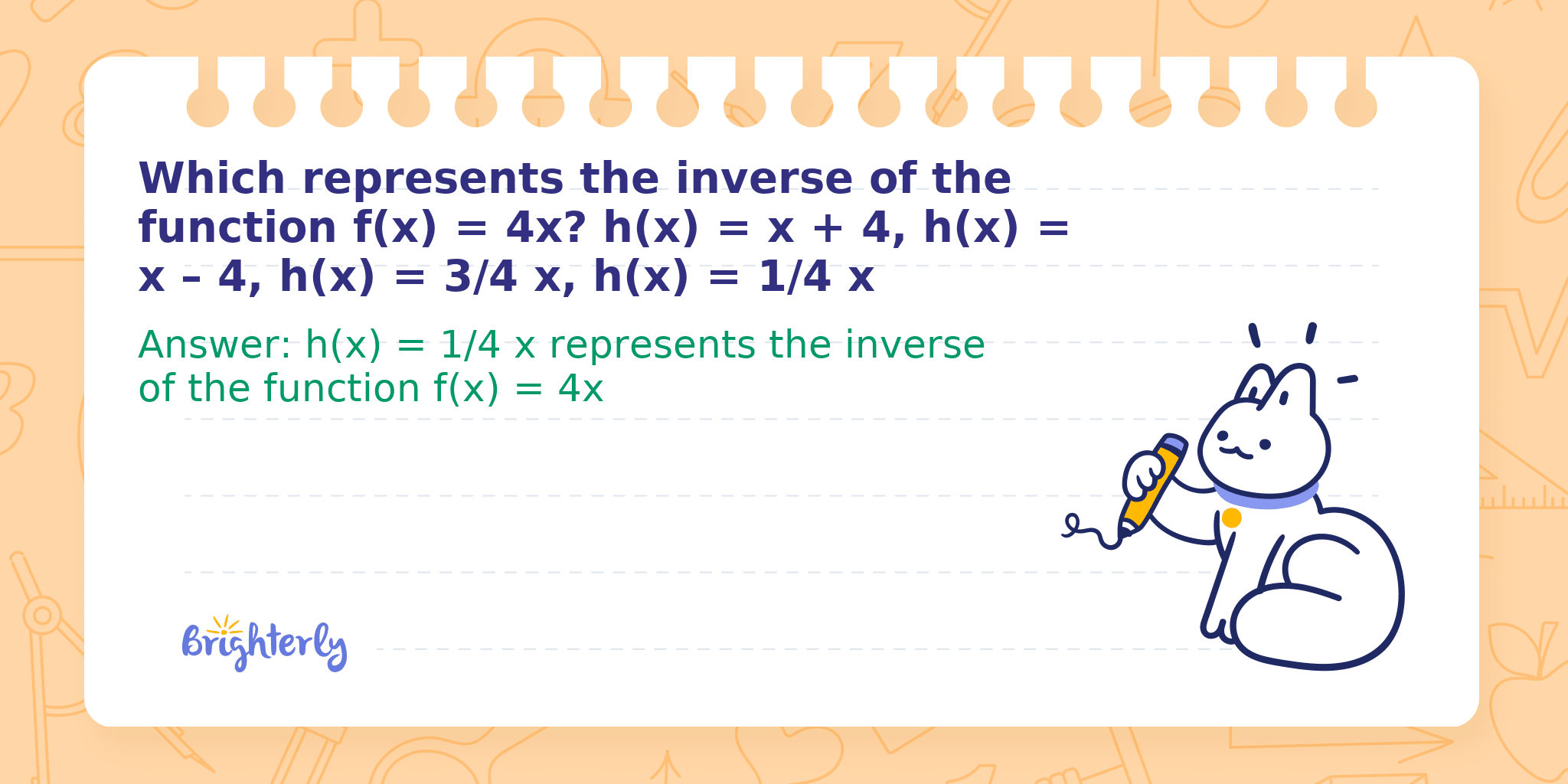 Answer: h(x) = 1/4 x represents the inverse of the function f(x) = 4x