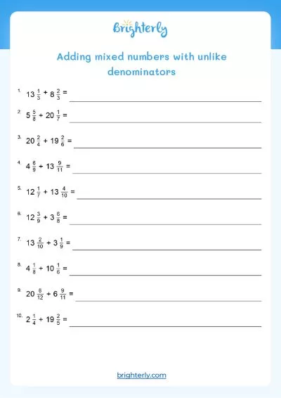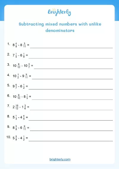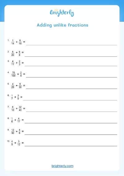 Start by downloading the free adding and subtracting fractions worksheets pdf. Then, use our worksheets to help students practice adding and subtracting fractions with unlike denominators. We provide exercises that cover all the basics, from adding and subtracting simple single fractions to more complex mixed numbers.