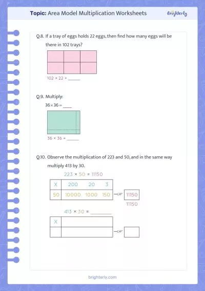 Regular practice with area model multiplication worksheets PDF can help students improve their proficiency and reinforce their learning. In addition, due to its visual nature, area model multiplication can boost students’ self-assurance when solving multiplication problems.Practicing with 3-digit by 2-digit multiplication area model worksheets requires students to think creatively about dividing a problem into smaller pieces. As a result, they can foster their powerful reasoning abilities and become better problem solvers.