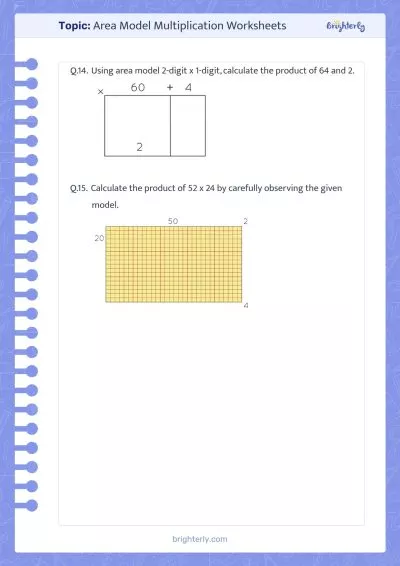 Multiplication problems that are varying in difficulty are frequently included in area model multiplication worksheets. For example, they might begin with simple duplication issues as seen in the 2 digit by 2 digit multiplication area model worksheets, then step-by-step progress to more challenging problems, including multi-digit factors. These worksheets are intended to support learning and give students good practice opportunities.