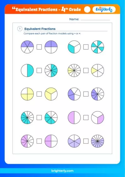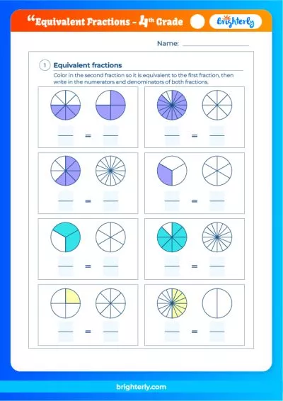Equivalent fractions 4th grade worksheets show kids that fractions can be like nicknames — with different names still meaning the same friend. Equivalent fractions are one of the most important grade 4 math concepts. By using multiplication and division, your children will learn how to create equivalent fractions with a common denominator and reduce them to their simplest form. With practice, the idea of equivalence will become less abstract for your child, helping them feel more confident working with fractions in class and beyond.