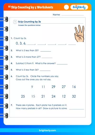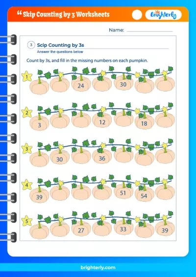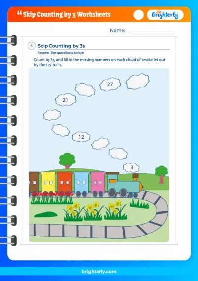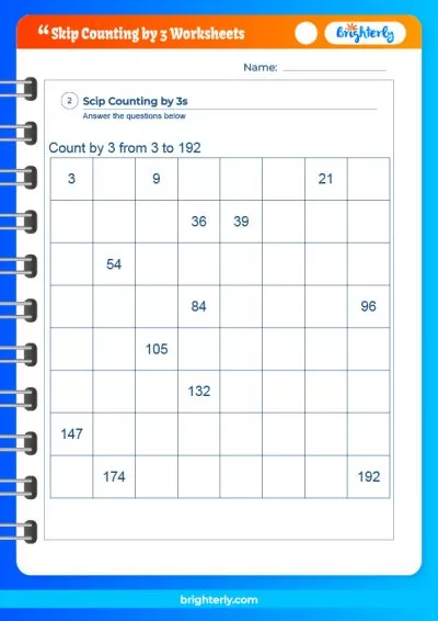 Skip counting by 3 adds 3 to itself and every next value from each summation. A skip counting by 3 worksheet will help a child grasp the concept of skip counting quickly, understand the sequence of numbers, and learn to recognize math patterns.