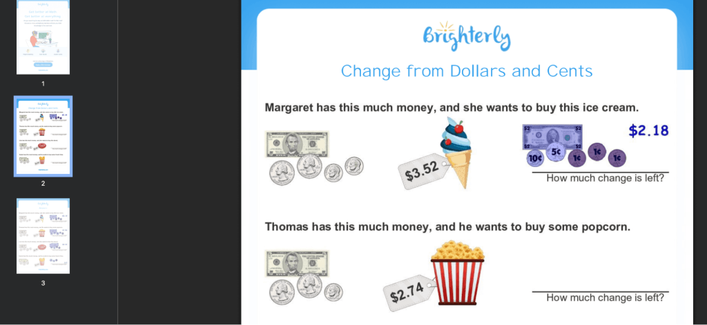 Brighterly’s money worksheets make children more confident in performing money operations. Such confidence and independence are crucial, as adults won’t always be nearby to solve their problems.