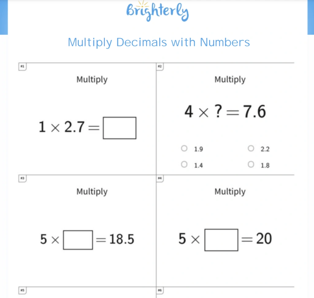 As well as multiplying decimals by whole numbers and other decimals, kids will practice different types of sums and approaches to multiplying decimals. Some of our problems feature missing terms in an equation that kids need to identify, giving them a rounded education on multiplying decimals.