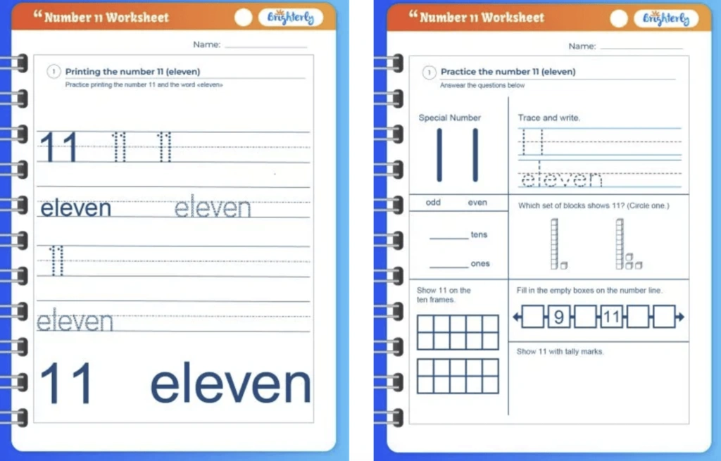 Brighterly’s number 11 worksheets for kindergarten PDF and number 11 worksheet for preschool are available for offline use. Simply download them in PDF format and print them on paper. Download the number 11 printable here: