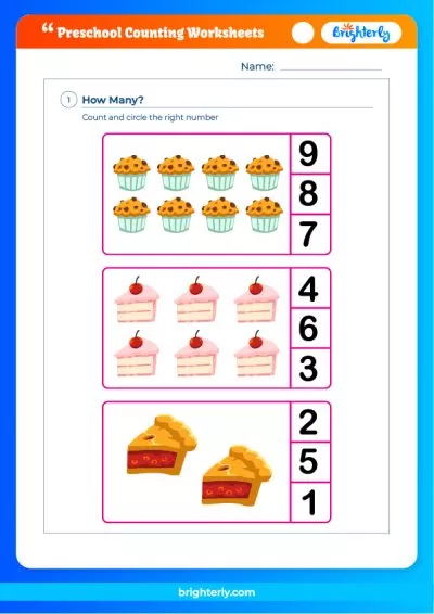 Printable worksheets make learning easy for children and parents alike. Your kid enjoys fun counting games and puzzles while you receive free and convenient learning materials for your child. At Brighterly, you can download preschool and pre-k counting worksheets for free in a blink of an eye. Just open the chosen worksheet, download it, and print it.