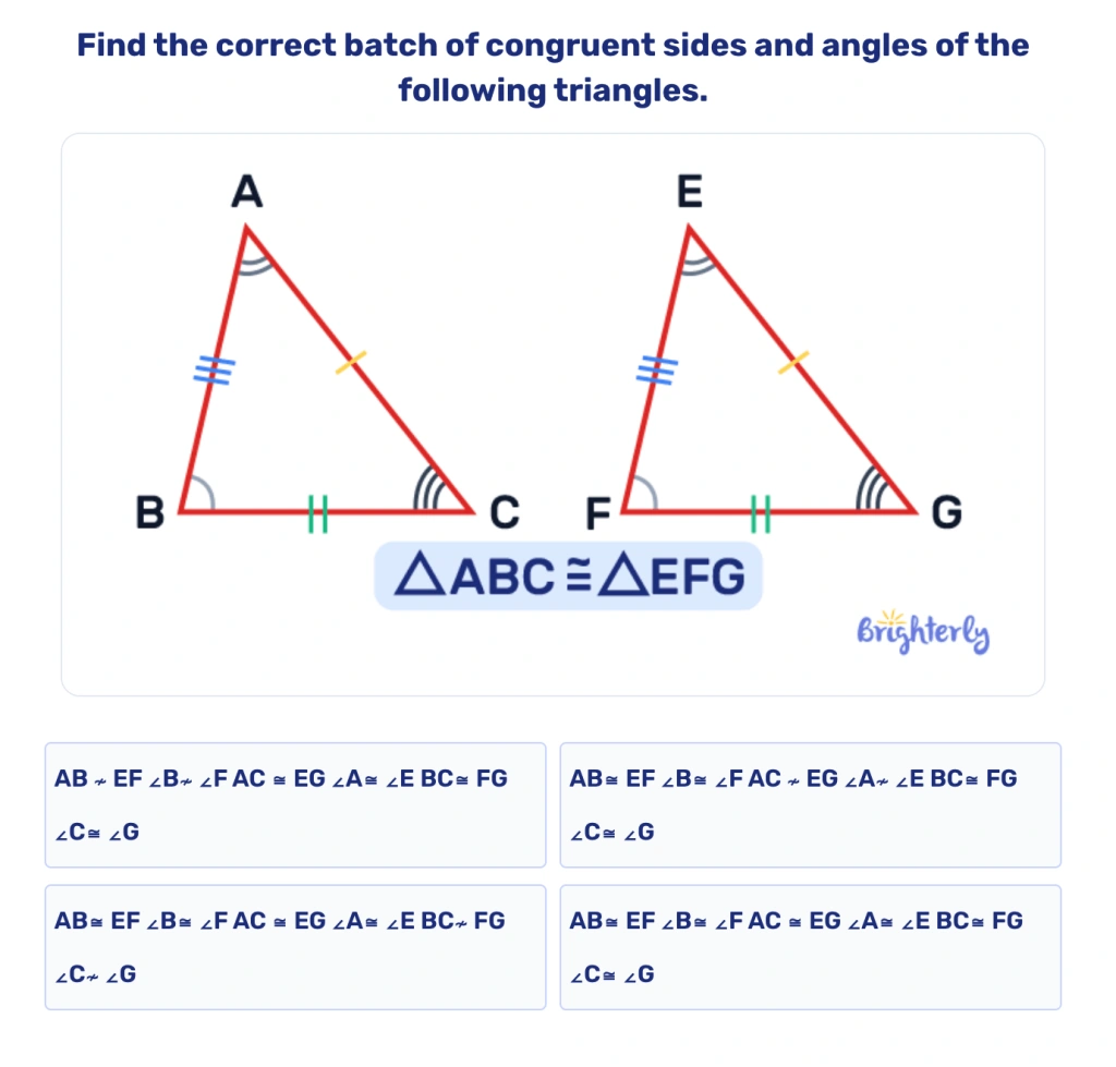 Reading text geometry problems is boring; that’s why all Brighterly triangle congruence worksheets have visuals for each problem. This makes practice regular and fun without the burden of traditional learning.